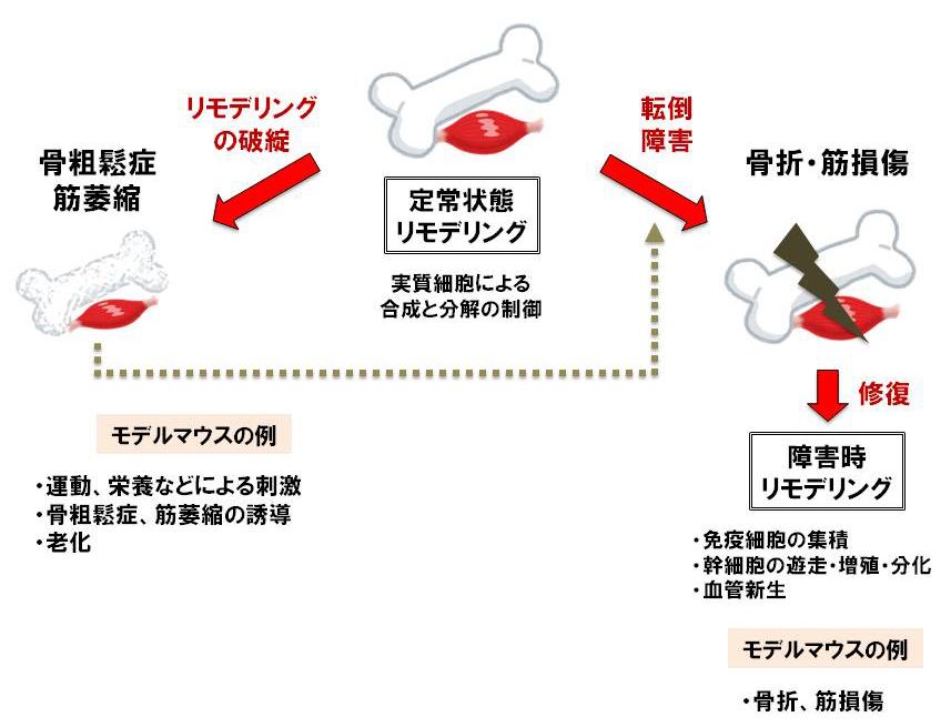 運動器のリモデリング(再構築:合成(形成)と分解(吸収)の繰り返し)には、定常状態のリモデリングと骨折や筋損傷などの障害時リモデリングがあります。骨と骨格筋の恒常性維持に関わる新規因子を発見するため、それぞれの段階にあったリモデリングを操作した各種モデルマウスを作成し、遺伝子発現の網羅的解析やタンパク質の解析を行っています。現在、骨芽細胞による骨髄中の血管と神経の調節機構や、免疫細胞による骨格筋再生の新しい制御機構を見出しています。今後も健康長寿につながる新しい運動器恒常性維持機構の解明を目指します。