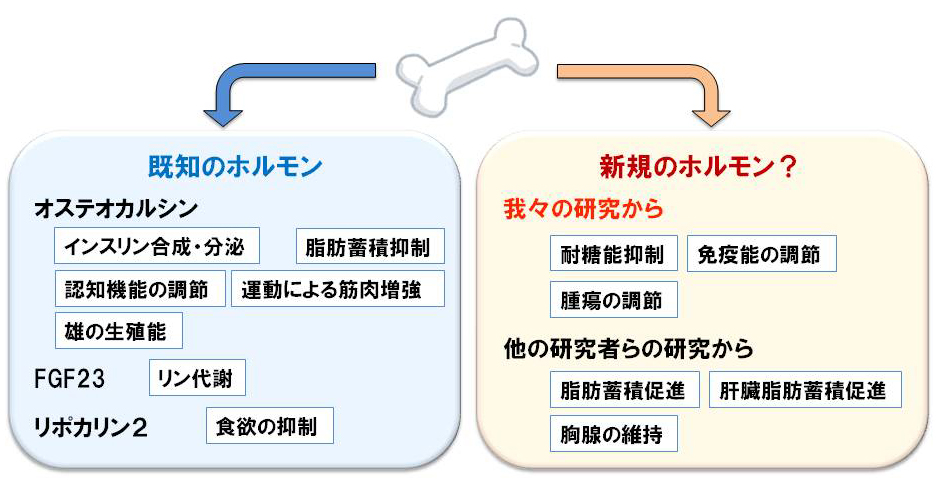 最近私は、既知骨ホルモンでは説明できない骨の新しい内分泌作用を発見しました(未発表)。そこで、新規骨ホルモンの発見および骨組織による新たな生体機能調節機構の解明を目指して解析を進めています。現在、新規骨ホルモンの候補をスクリーニングし、分子レベルから細胞・個体レベルの解析を行っています。