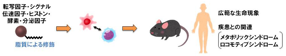 脂質によるタンパク質翻訳後修飾は、タンパク質の局在・安定化・活性などを制御し、シグナル伝達経路などに深く関わっています。そこで、脂肪酸アシル化修飾による生体恒常性維持機構とその変容による疾患を研究し、新たな概念の構築や生命現象の根幹に関わる研究を推進していきます。