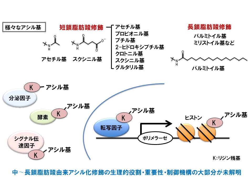 最近私は、世界でも報告のないリジン残基への中鎖脂肪酸アシル化修飾を発見しました(未発表)。中〜長鎖脂肪酸由来アシル化修飾の研究報告は世界でも極めて少なく、大部分が未解明です。今後も、a.中鎖脂肪酸アシル化修飾機構の解明、b.新規中鎖脂肪酸アシル化修飾タンパク質の同定とその機能解析、c.中鎖脂肪酸アシル化修飾の個体レベルでの役割解明など、独創的な研究を展開していきます。