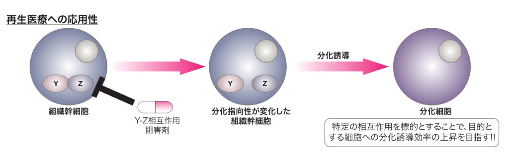 多能性幹細胞や組織幹細胞は様々な細胞に分化することが出来ますが、それらを選択的に特定の細胞へ分化誘導する技術に関しては十分には確立されていません。我々はタンパク質間相互作用という点に着目することで、細胞の分化指向性の制御機構の解明および再生医療への応用性が高い分化誘導技術の開発を目指します。